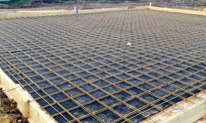 - fondation de dalle cher, mais le plus fiable. Le renfort est utilisé avec un diamètre d'au moins 12-16 mm - plus le bâtiment est grand et lourd, plus le sol est difficile, plus les tiges doivent être épaisses. Avec une épaisseur de plaque supérieure à 15 cm, l'armature est posée en deux ou plusieurs bandes;