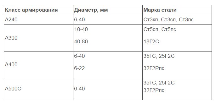 - les barres des classes A240, A300, A400, A600, A800, A1000 sont produites avec un diamètre de 6-80 mm, et les barres d'armature des classes A500C et B500C avec un diamètre de 4-40 mm;