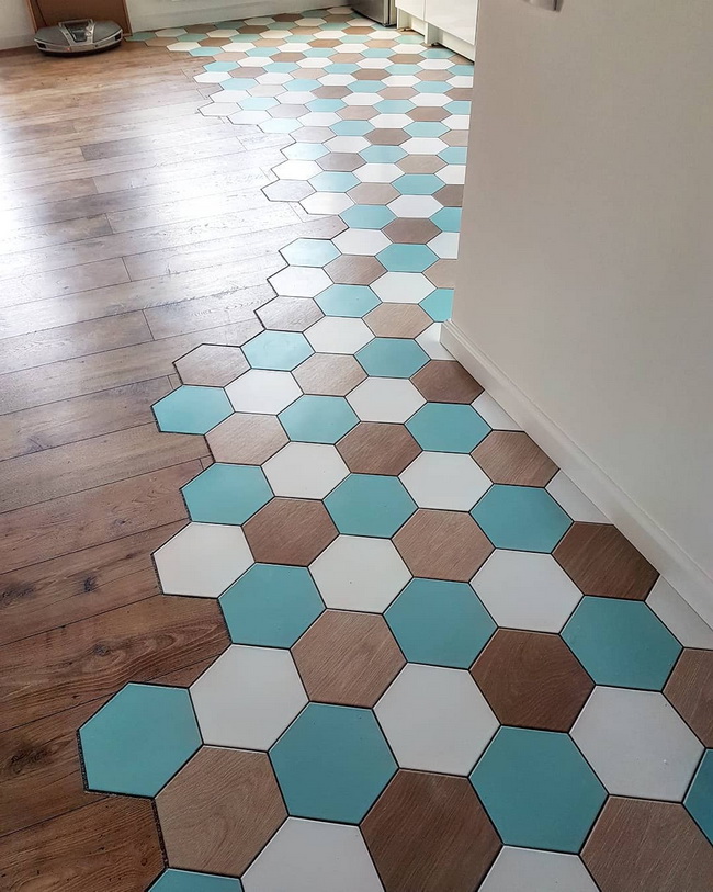 Le stratifié et le carrelage se trouvent, en règle générale, à la frontière de deux pièces ou dans la même pièce, si nécessaire diviser en zones. Un exemple frappant est la conception d'une grande cuisine, si nécessaire mettre en valeur les espaces de travail et de restauration, ou le hall d'entrée, qui pénètre en douceur dans le salon.