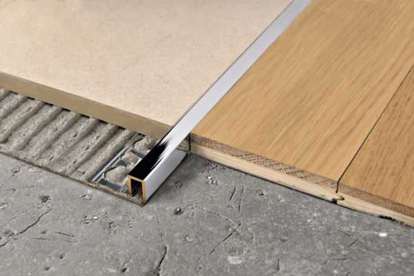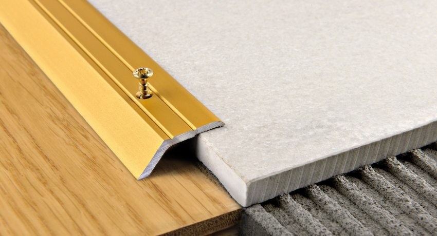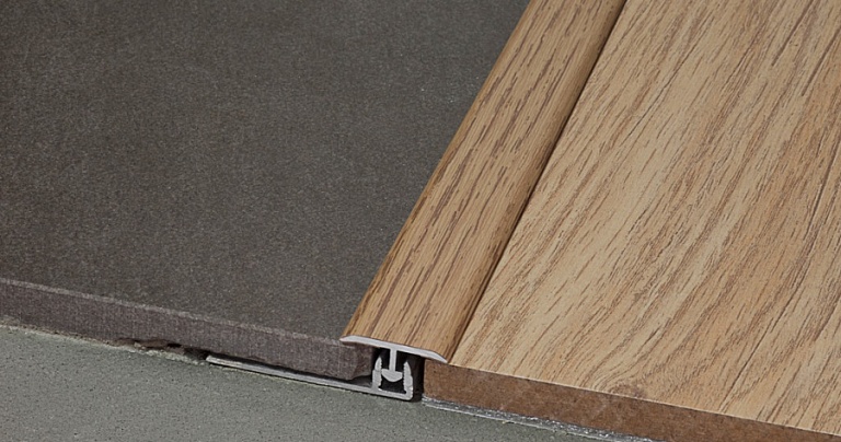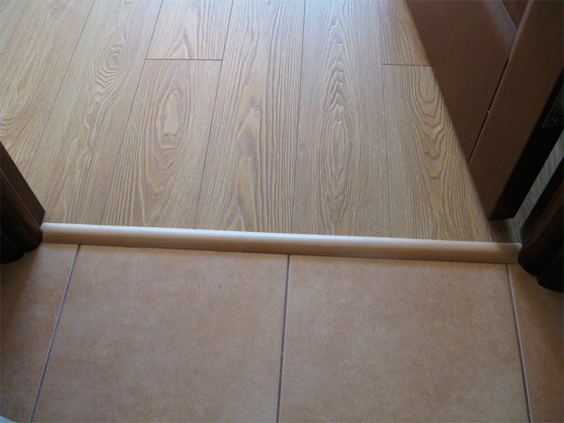 Il s'agit d'une solution plus simple, par conséquent, est utilisée plus souvent. Si le profil de l'amarrage est choisi correctement et que tout le travail est effectué correctement, le revêtement de sol sera bon. L'assemblage d'un stratifié et de carreaux à l'aide d'une doublure décorative sera possible pour une personne ayant peu d'expérience en construction, donc si les réparations sont faites de vos propres mains, il est préférable de choisir cette option. La facilité d'installation n'est pas le seul avantage de cette méthode d'ancrage. La plaque de couverture vous permet de masquer un espace de compensation assez large, de sorte que le stratifié ne gonfle pas et ne se déforme pas.