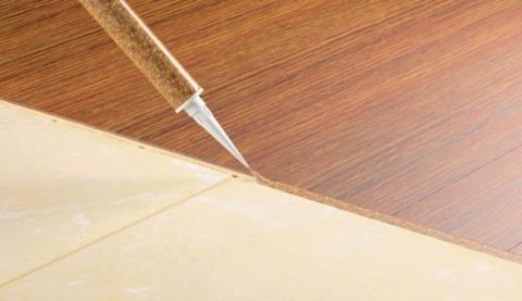 Un bouchon de fluide est quelque chose entre un scellant et un bouchon. Le matériau est obtenu à base de copeaux de liège et de colle. Il est vendu dans des tubes qui sont insérés dans un pistolet de construction. L'utilisation d'un tel appareil est très facile à remplir dans tous les joints, y compris forme complexe. L'élasticité du matériau vous permet de compenser les coupures inégales. De plus, le liège liquide contient déjà des composants pour protéger le stratifié de l'humidité, donc aucune mesure supplémentaire n'est nécessaire.