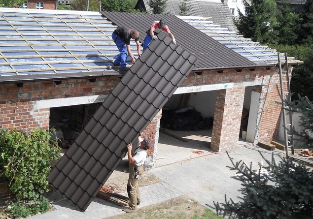 La tuile métallique peut être utilisée sur les toits avec un angle d'inclinaison de plus de 15 degrés, sinon, en raison du relief du revêtement, le flux de neige sera compliqué. Le matériau est souvent utilisé lorsque le garage est situé sur le même site que la maison, de sorte que tous les bâtiments ont le même type de toit.