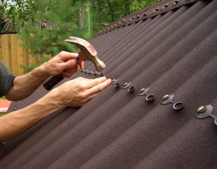 Ondulin est attaché à la caisse d'une barre en bois, et les barres doivent être strictement parallèles les unes aux autres. Les feuilles d'onduline sont encore plus facilement coupées au sol. Les travaux d'installation sont effectués à une température positive, les feuilles d'onduline sont fixées sur du matériel spécial à larges chapeaux.