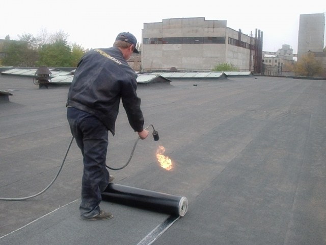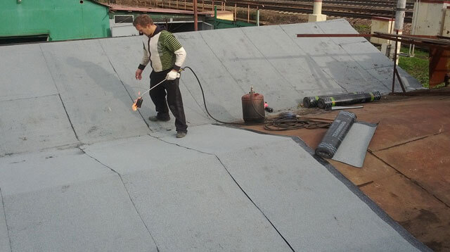 - procéder à l'installation du matériau de toiture, qui est posé en bandes dans le sens transversal à l'angle d'inclinaison, la base est lubrifiée avec du mastic à béton, la couche inférieure de bitume est chauffée avec un brûleur à gaz. Les feuilles qui se chevauchent font 10-15 cm, commencez l'installation à partir du bas du toit. Après cela, le matériau de toiture est monté dans la direction perpendiculaire, le maculant de bitume;