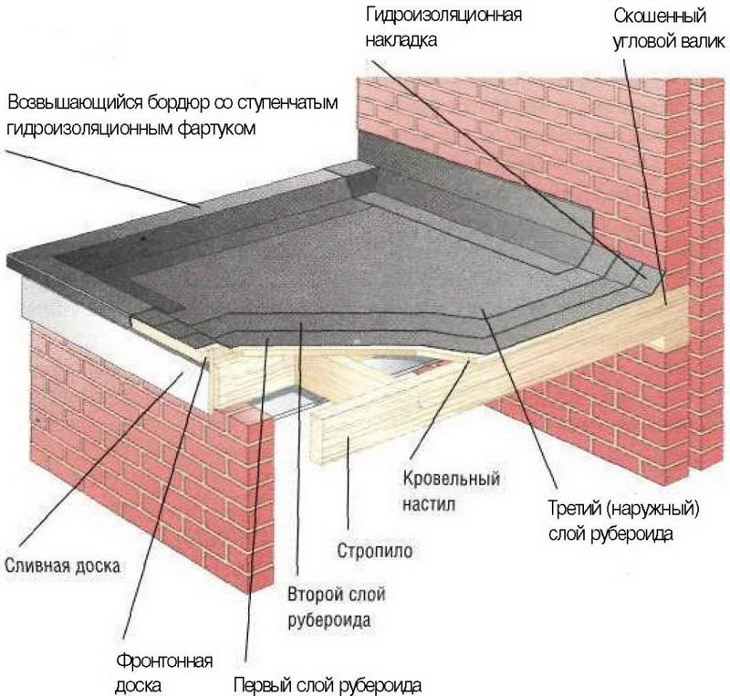Ruberoid idéal pour les toits en pente, presque plats (pente jusqu'à 5 degrés). Sur la base en béton du toit, effectuez d'abord chape, créant une légère pente pour de meilleures précipitations. Pour le coffrage de chape à partir de planches, béton mieux remplir à la fois. Après 3-4 jours, vous pouvez retirer le coffrage, et lorsque le béton prend bien (15-20 jours), vous pouvez continuer installation de matériaux de toiture. En bref, le processus ressemble à ceci: