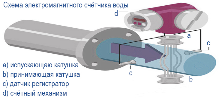L'idée de base ici est la même que dans les compteurs à ultrasons, seule la quantité d'eau traversant le compteur est fixe en raison du champ magnétique. La bobine indique des ondes électromagnétiques, et les capteurs analysent comment ces ondes changent après avoir traversé un jet d'eau. Les informations sur ces changements nous permettent de conclure sur le volume d'eau.