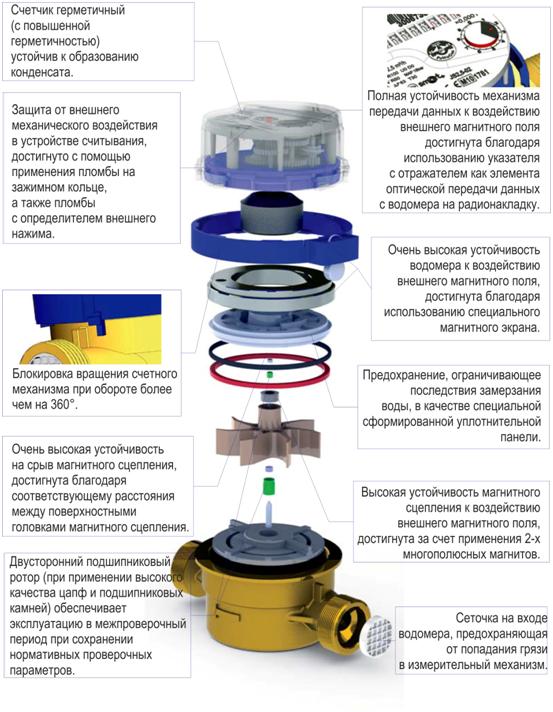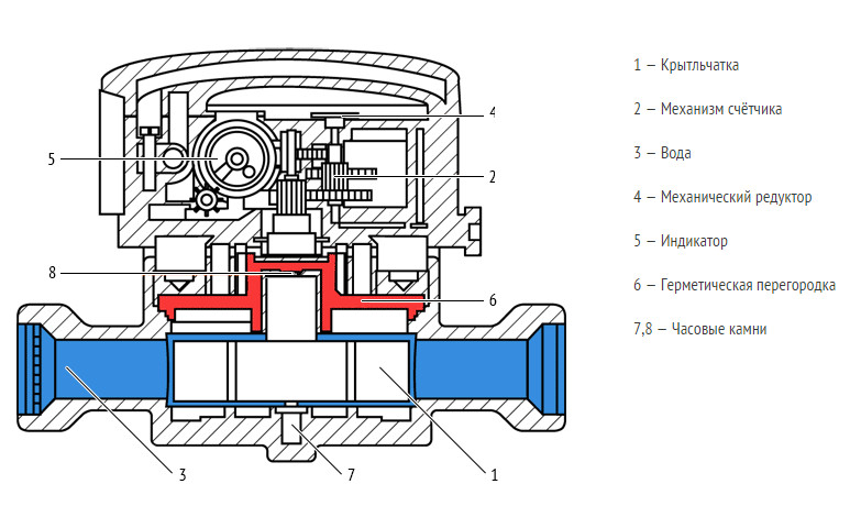 - Mouillélorsque ces éléments sont situés dans l'eau. Il s'agit d'une conception plus simple, car le couple provenant de la roue ou de la roue est transmis directement au mécanisme de comptage. De tels compteurs d'eau coûteront moins cher et le champ magnétique ne peut en aucun cas les affecter. D'un autre côté, comme les pièces clés seront en contact constant avec l'eau, la durabilité de la structure est réduite. Si dans la région il y a des problèmes avec la qualité de l'eau (elle a une rigidité accrue), alors le mécanisme peut être contaminé et désactivé;