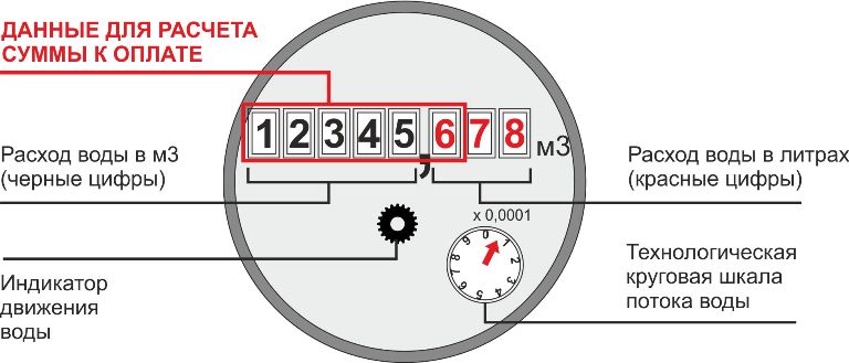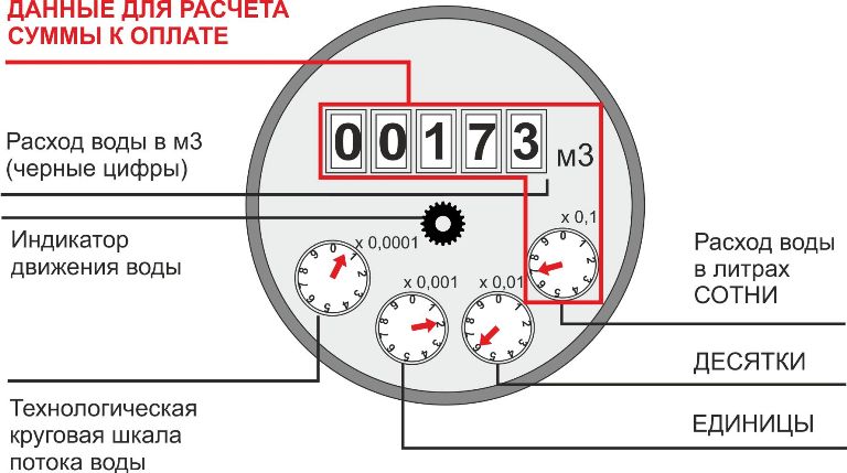 Quant à écailles, alors dans la plupart des compteurs, vous verrez des chiffres noirs et rouges. Les chiffres noirs vont droit au but et indiquent le nombre de mètres cubes consommés. Les chiffres rouges après la virgule décimale sont des litres de 1 à 999. Certains compteurs d'eau ont un comparateur qui mesure les millilitres. Plus rarement, il existe une option dans laquelle seuls les mètres cubes sont affichés sur une échelle numérique, et des centaines, des dizaines et des unités de litres, ainsi que des millilitres d'eau consommée, sont affichés sur des échelles à cadran.