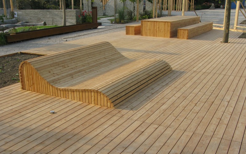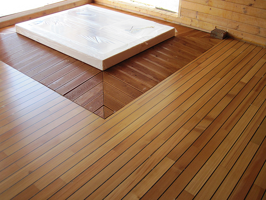 În al doilea caz se utilizează cherestea de punte. Caracteristica sa este că piesele sunt așezate cu un decalaj mic și clafoane rotunjite la colțuri. În acest fel, murdăria sau apa scade. Din acest material, podelele sunt realizate pe punțile vaselor, acostări, piese, terase, zone publice, foisoare, adică în instalațiile exterioare, când umiditatea ridicată devine o amenințare directă.Lemn de conifere siberian nerelocuit în băi, saune, băi. Dacă doriți, brazdele pot fi aplicate pe un astfel de podea, astfel încât o persoană să nu alunece.