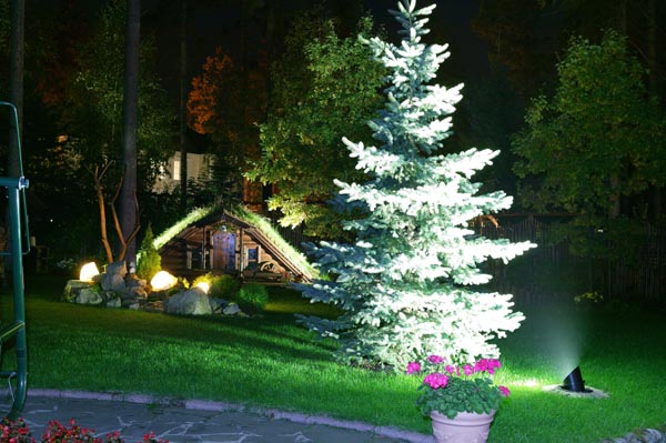 - iluminat decorativ. Aceasta include lămpi care sunt concepute pentru a decora și a atrage atenția asupra elementelor interesante ale peisajului, mai degrabă decât pentru a da o lumină completă. Dealurile alpine, iazurile, coroanele copacilor, zonele de agrement sunt echipate cu un astfel de iluminat și sunt utilizate pentru acest lucru bandă led, felinare, figuri de grădină cu lumini încorporate, lămpi care pot străluci în culori diferite și alte elemente.