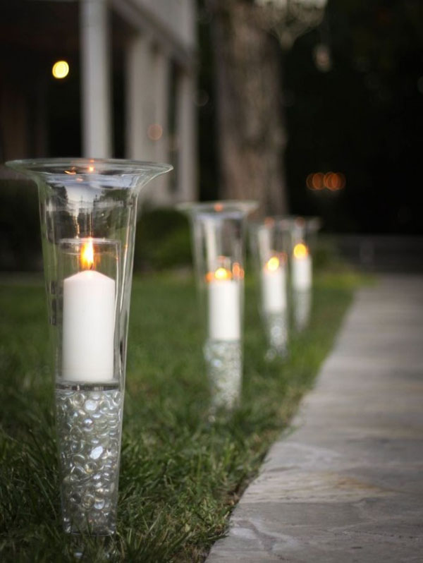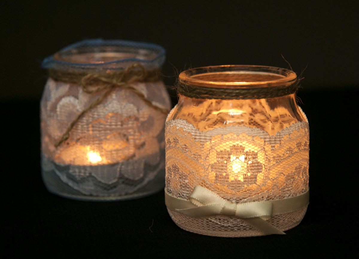 - spre fund borcane de sticlă Puteți turna nisip, pietricele, pietre colorate și puteți pune lumânări. În exterior borcanul poate fi decorat cu frânghie, țesătură, dantelă, etc .;