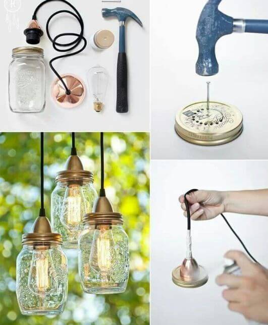 Orice poate deveni o lampă originală în care poți pune o ghirlandă sau o lumânare. Lumina va pătrunde prin numeroase găuri realizate sub formă de model, le puteți crea pe bancă folosind cuie de diametre diferite și un ciocan. Pentru a face mai ușor, puteți întâi schița pe hârtie, apoi, aplicând hârtie la bancă, puteți transfera desenul. În interiorul cositorului, este mai bine să puneți o bucată de lemn de formă cilindrică, pentru a nu deforma borcanul în timpul creării găurilor. Lămpile pot fi amplasate sau agățate în jurul site-ului.