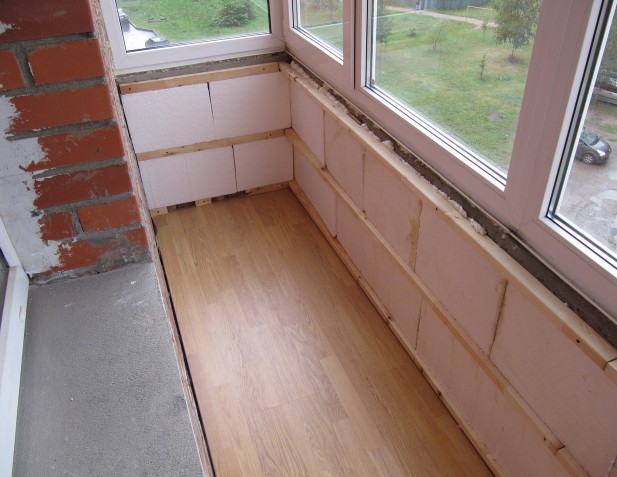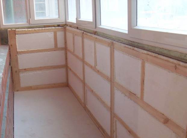 - Alors aussi nous construisons une caisse, avec un pas d'environ 50 cm, la fixation de planches de bois avec un perforateur -percer aux murs et au plafond du balcon à l'aide de coins et de chevilles. Si vous isolez le sol, procédez de la même manière, mais en utilisant des planches de bois de plus grande épaisseur 50 × 100 mm pour créer une bonne résistance.