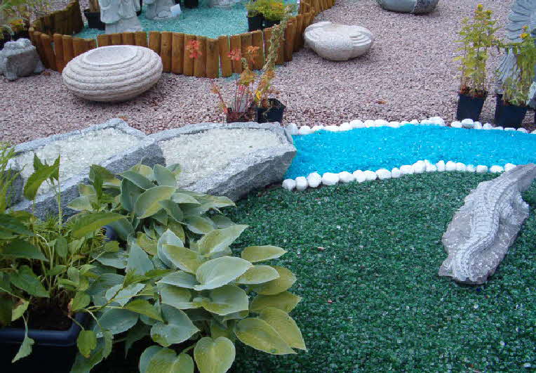 - Un chemin à partir de gravats de verre est créé rapidement et facilement. Le marquage est fait, une couche de terre est enlevée à une profondeur de 10-15 cm.Les jardiniers expérimentés utilisent un mélange de géotextiles pour la couche inférieure. Une telle connexion empêche la décantation du gravier de verre, empêche l'érosion et protège contre la végétation indésirable. Couche supérieure de géotextile une pierre concassée d'environ 2,5 cm d'épaisseur est coulée et votre chemin de verre est prêt!