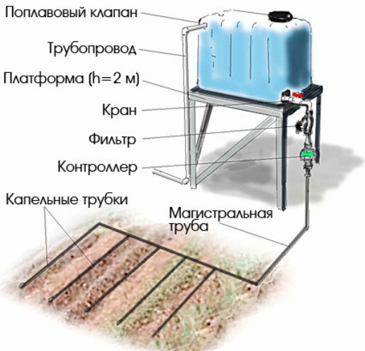 À travers la canalisation principale depuis la source, l'eau est acheminée vers des bandes spéciales et des compte-gouttes, grâce auxquels elle pénètre dans le sol «ciblé», directement aux racines de la végétation. La saturation maximale en humidité se produit. En raison de l'augmentation de la quantité d'eau dans la terre, les plantes n'ont pas besoin d'avoir peur des gelées soudaines.