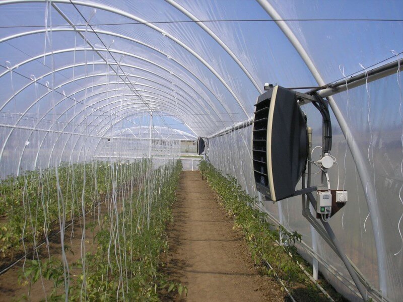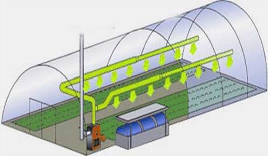 Le dispositif de chauffage et de ventilation est placé sur des structures portantes, la fondation ou sur des supports dédiés. Le flux chaud va vers le haut ou le milieu serre ou serre. Cela empêche les brûlures des plantations et le dessèchement des feuilles et des tiges. Un tuyau spécial perforé en polyéthylène est réparti sur la zone de la serre, assurant le même chauffage du sol.