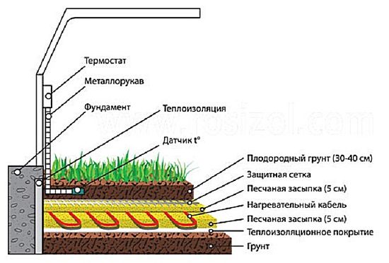Pour installer le chauffage par câble, vous devrez retirer une partie de la terre, faire une couche de sable et poser le fil lui-même. Par le haut, il est nécessaire de poser un matériau isolant thermique spécial, qui ne permettra pas à la chaleur de descendre, profondément dans le sol, et protégera le câble contre l'humidité excessive et divers dommages et charges mécaniques.