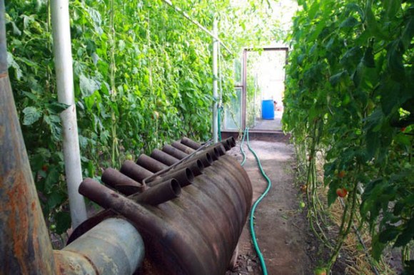 - Pipes. Ils forment 2 circuits de chauffage - souterrain, où tuyaux en plastique avec 30 degrés d'eau sont près des racines des plantes. Avec ce réchauffement, vous réduirez le processus de végétation et augmenterez les rendements des cultures. Et le deuxième circuit - les radiateurs chauffent l'air bombé de la structure;