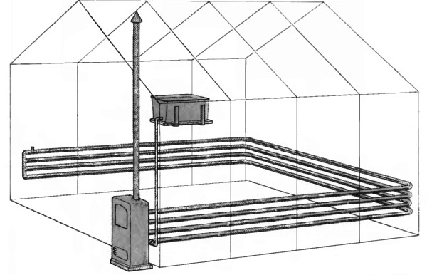 Dans une spéciale chaudière l'eau est chauffée et envoyée aux tuyaux à l'aide d'une pompe de circulation. L'emplacement des tuyaux peut être différent: le long des murs de la pièce ou entre des plantes en croissance.