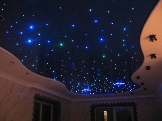- Conception d'éclairage. L'utilisation de plafonds tendus offre également plus de possibilités de création éclairage unique. Le plafond peut être éclairé de l'intérieur, créant ainsi un effet étonnant. Un exemple frappant est la conception très populaire sous la forme d'un ciel étoilé, mais en fait, il y a beaucoup de variations;