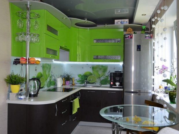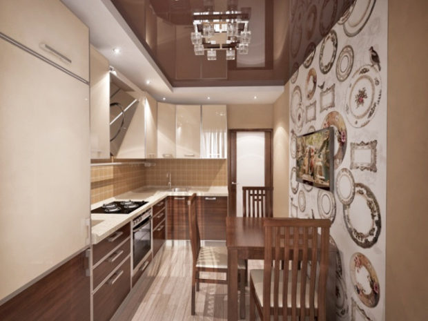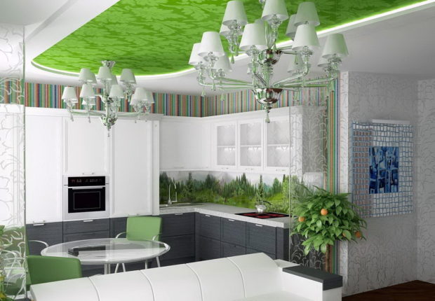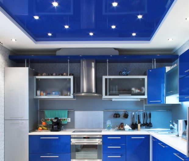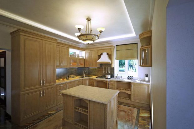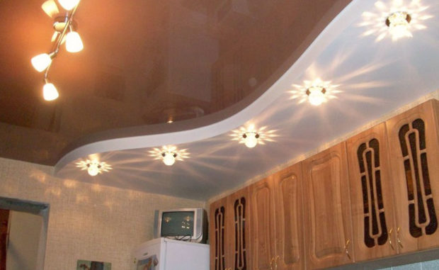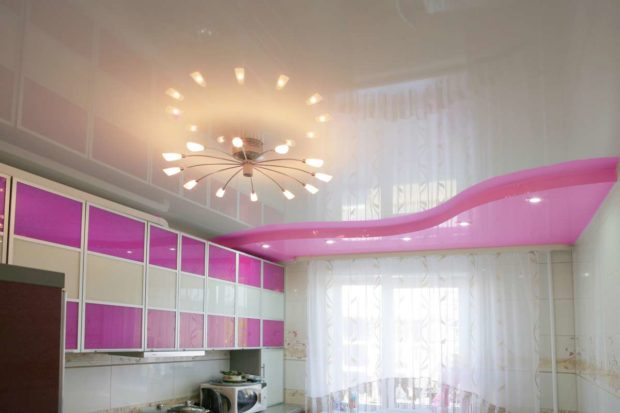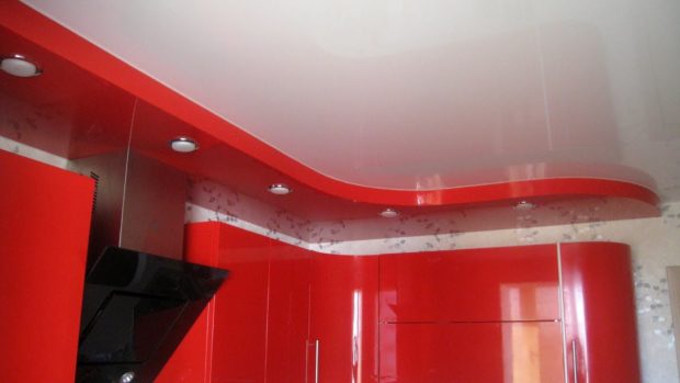 Dans la cuisine, les plafonds à deux niveaux ne sont utilisés que si la pièce a une disposition libre, c'est-à-dire qu'elle représente le studio. Ensuite, vous pouvez zoner visuellement la partie de la pièce où la cuisson a lieu directement depuis la partie salle à manger ou salon. Habituellement, ils réalisent un cadre étroit, le long du périmètre duquel se trouvent de nombreux projecteurs. Et au centre ils réalisent une toile en polychlorure de vinyle de couleurs claires.
