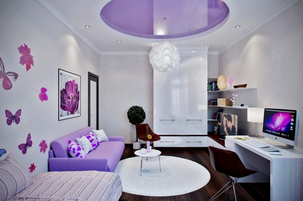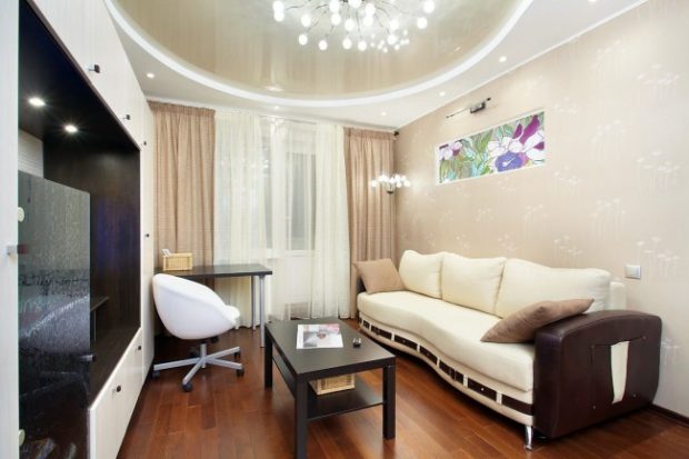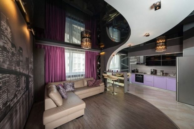 - Zonage. Les plafonds tendus, ainsi que les solutions en plaques de plâtre, offrent des possibilités presque illimitées pour créer différentes zones décoratives. Ainsi, il est possible de réaliser des formes et des transitions complètement différentes, créant un design vraiment unique;