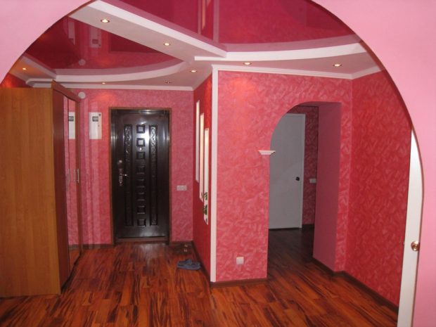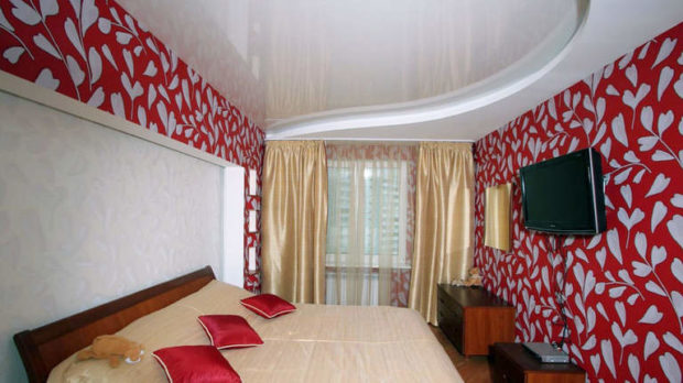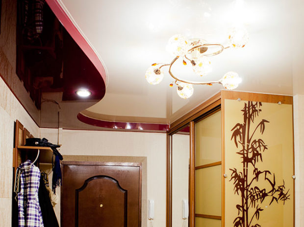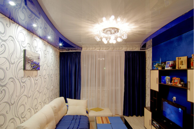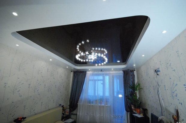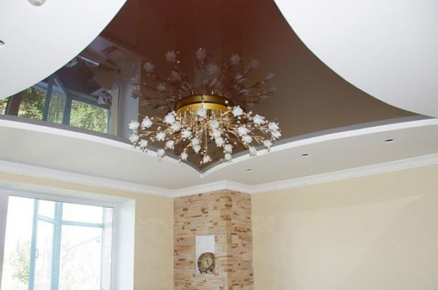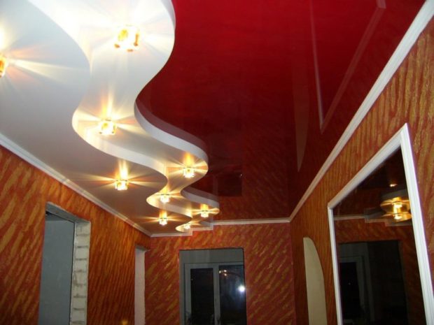 - Augmentation visuelle de l'espace. C'est l'une des propriétés clés des plafonds tendus à deux niveaux qui élargissent visuellement la surface de la pièce, surtout si vous utilisez un film PVC brillant. Il a un effet miroir et la réflexion, comme vous le savez, se caractérise par une expansion visuelle de l'espace;