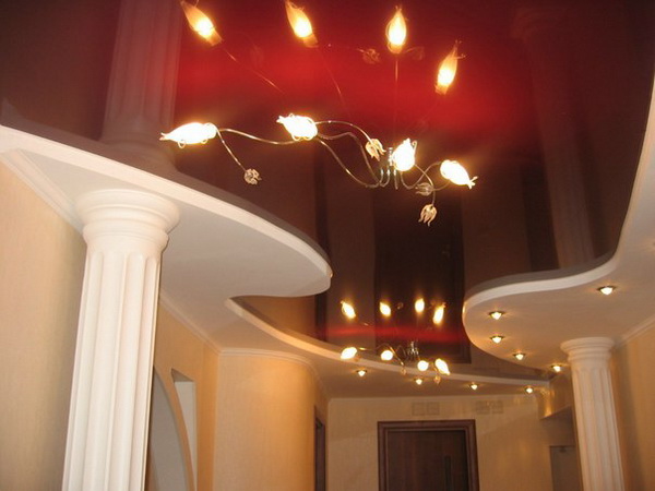 - Diminution de la hauteur du plafond. Vous devez comprendre que lors de l'installation du système de suspension, un espace est formé entre la partie portante et le plafond lui-même, plus tenir compte de la hauteur du deuxième niveau. Si la pièce est très petite, même quelques petits centimètres peuvent réduire considérablement l'espace. Mais vous pouvez utiliser une texture brillante - cela rendra la pièce visuellement plus élevé. Dans tous les cas, ce facteur doit être pris en compte;