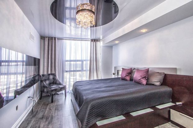 Le type de toile le plus populaire avec une fonction réfléchissante qui vous permet d'agrandir visuellement l'espace petites pièces. N'oubliez pas qu'avec une augmentation de la saturation vers la couleur foncée - les propriétés du miroir augmentent. Avec cette extension visuelle, des éléments réfléchissants supplémentaires sont ajoutés, vous devez donc penser à tout dans les moindres détails. Sinon, cela introduira un certain déséquilibre dans la perception.