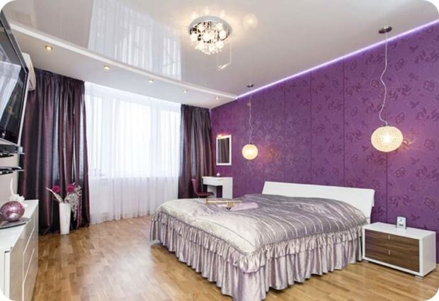 Ce type de matériau est souvent utilisé en conjonction avec une toile brillante, car il adoucit sa netteté. Il est approprié dans diverses directions du design d'intérieur, il peut donc devenir un facteur important qui met l'accent sur le concept général de design. Le film mat se combine bien avec une grande variété d'éclairage et vous permet d'appliquer des techniques de composition complexes lorsque vous avez besoin d'augmenter le volume et la profondeur de l'éclairage.