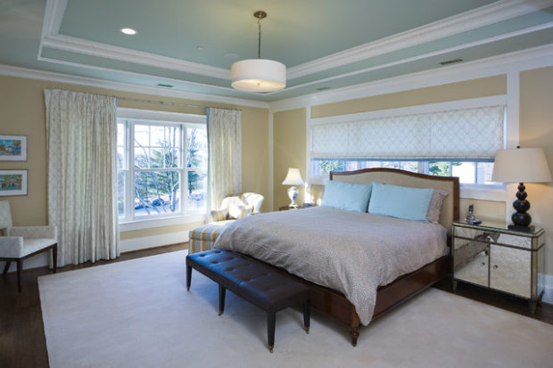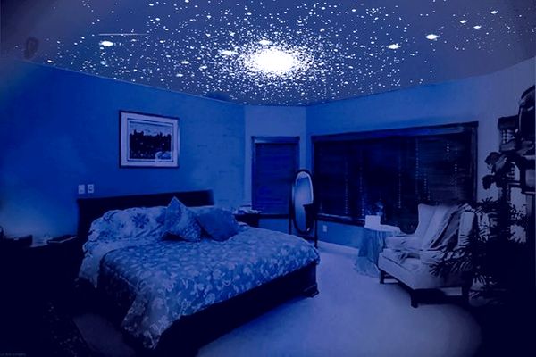 La chambre n'est pas un endroit où les expériences avec des couleurs flashy sont appropriées, car c'est un territoire de détente et de tranquillité, donc des couleurs pastel claires prédominent ici, avec un éclairage assez doux. Pour la chambre à coucher, ils font souvent un plafond dans le style d'un ciel étoilé, mais il n'est pas nécessaire d'utiliser des nuances de bleu foncé, mais des tons clairs tels que blanc laiteux, rosâtre, bleu clair, qui auront également fière allure avec le scintillement des étoiles LED.