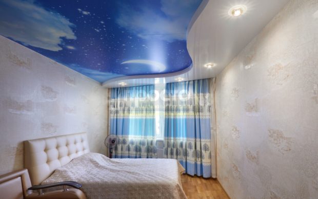 - Conception d'éclairage. L'utilisation de plafonds tendus offre également plus de possibilités de création éclairage unique. Le plafond peut être éclairé de l'intérieur, créant ainsi un effet étonnant. Un exemple frappant est la conception très populaire sous la forme d'un ciel étoilé, mais en fait, il y a beaucoup de variations;