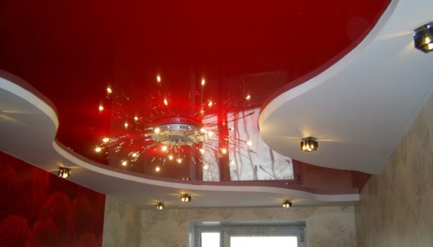 - Cloison sèche + film pvc. C'est aussi un moyen très populaire de faire un beau plafond. Habituellement, le premier niveau est un film de chlorure de polyvinyle extensible, qui dans sa texture et sa couleur est différent. Le deuxième niveau est fait de cloisons sèches et est une sorte de cadre pour le revêtement de tension. Le coût de ces réparations est doublé, car les deux types de finitions sont utilisés. Il est nécessaire de consacrer du temps décent et des ressources financières à l'achat de matériel approprié. Mais le résultat dans ce cas, à notre avis, est le meilleur.