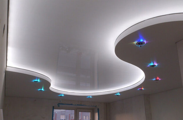 L'organisation de l'éclairage est très importante lors de la mise en œuvre de plafonds tendus à deux niveaux. Vous pouvez obtenir des résultats impressionnants en plaçant correctement le rétro-éclairage. Il existe plusieurs types de sources lumineuses: