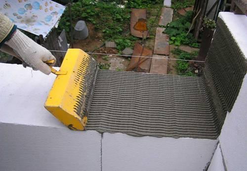 Tout d'abord, il convient de noter que lorsque vous travaillez avec des blocs de mousse, la première rangée est toujours placée sur le mortier de ciment, afin d'éviter diverses irrégularités (probablement possibles) de la fondation, et à partir de la deuxième rangée, de la colle est utilisée.