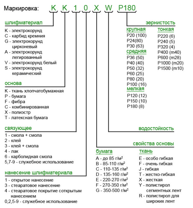 Toutes ces caractéristiques sont indiquées dans le marquage, qui est un code alphanumérique chiffrant ces informations. Il y a un certain nombre de notations spéciales utilisées dans le marquage, cependant, elles seront absolument inutiles pour l'utilisateur simple, car nous avons répertorié tous les principaux aspects qui méritent votre attention lors du choix du papier de verre.
