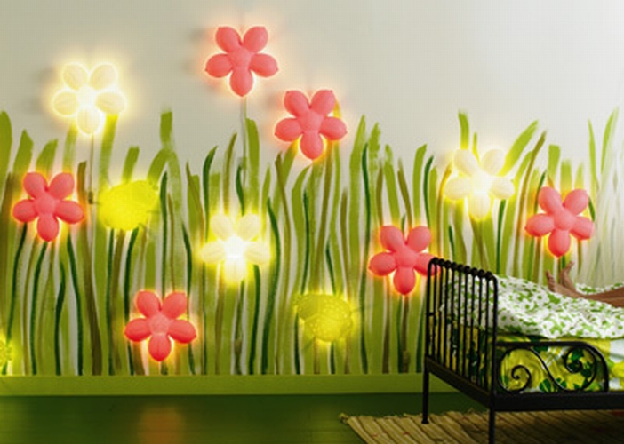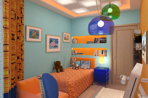 Herná zóna tiež stojí za ozdobu svojím osvetlením. Malo by to byť mierne jasné, zaujímavé, najlepšie originálne dizajnové žiarovky: vo forme rozprávkových postáv, lietadiel, kvetov, motýľov, balónov atď.Ak je dieťa už dosť staré a má svoj vlastný vkus, nemalo by byť na mieste pýtať sa ho na návrh miestnosti a osvetlenie v nej.