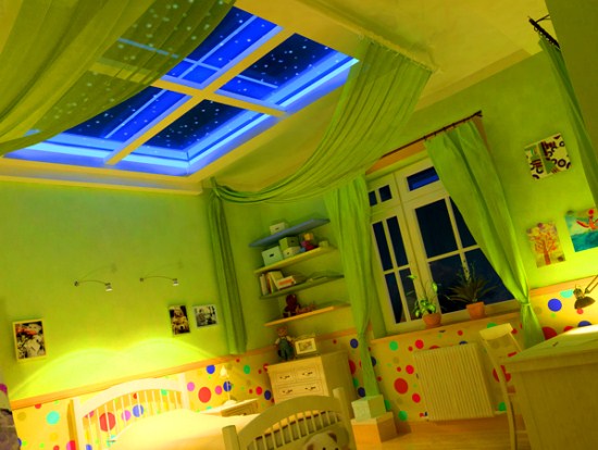 Zaujímavá možnosť pre detské izby - svetelné alebo nesprávne oknousporiadané na strope. Napodobňuje skutočný otvor okna, za ktorým často kreslia kresbu nočnej oblohy alebo denného svetla s mrakmi. Ak je hviezdna obloha ozdobnejším osvetlením, ktoré je potrebné používať v kombinácii s inými typmi, bude svetlo z jasnej oblohy postačovať na kvalitatívne zohrávanie úlohy hlavného osvetlenia.