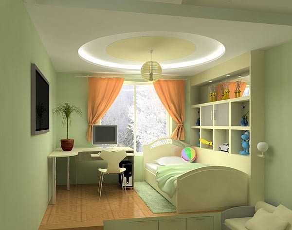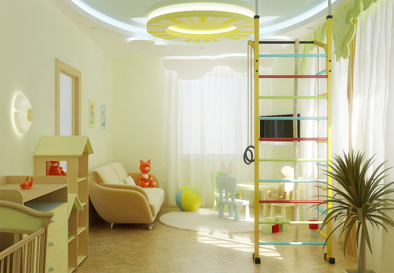 Alternatíva k obvyklému lustru - stropné svetlo: Výborne sa vyrovná so svojimi úlohami, zaberá trochu miesta a zároveň môže mať zaujímavý tvar, zdobí škôlku. Ďalšou možnosťou je bodové osvetlenie, ktoré sa dá ľahko zariadiť, ak škôlka používa zavesené alebo zavesené stropy. Reflektory umiestnené po obvode miestnosti dávajú rovnomerné mäkké svetlo, čo je v detskej izbe také potrebné. Niekedy je možné pomocou bodového osvetlenia vykonať zónovanie miestnosti.
