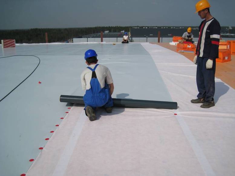 เยื่อหุ้ม PVC พวกเขายังเป็นวัสดุป้องกันการรั่วซึมมัลติฟังก์ชั่ซึ่งเหมาะสำหรับการแก้ไขหลังคาเก่าและสร้างใหม่ ฟิล์มดังกล่าวมีความทนทานและจะต้องมีการเปลี่ยนไม่ช้ากว่า 20 ปีดังนั้นจึงเป็นเรื่องที่น่าดึงดูดใจสำหรับการสร้างการป้องกันความชื้นอย่างมีประสิทธิภาพ ภาพยนตร์ดังกล่าวประกอบด้วย 3 ชั้นด้านนอกและด้านในเป็นพีวีซีสีธรรมดาและชั้นในเป็นโพลีเอสเตอร์เสริมแรง เยื่อเหล่านี้มีขายในม้วนและ แนบเครื่องจักร หรืออื่น ๆ วิธีบัลลาสต์. ในกรณีที่สองความลาดเอียงของหลังคาไม่ควรเกิน 10% ด้วยวิธีบัลลาสต์เมมเบรนวางอยู่บนพื้นผิวหลังคาและกรวดจะเทลงบนหรือ หินบด. ที่ยึดแบบกลไกคือสกรูตะปูลวดเย็บกระดาษ